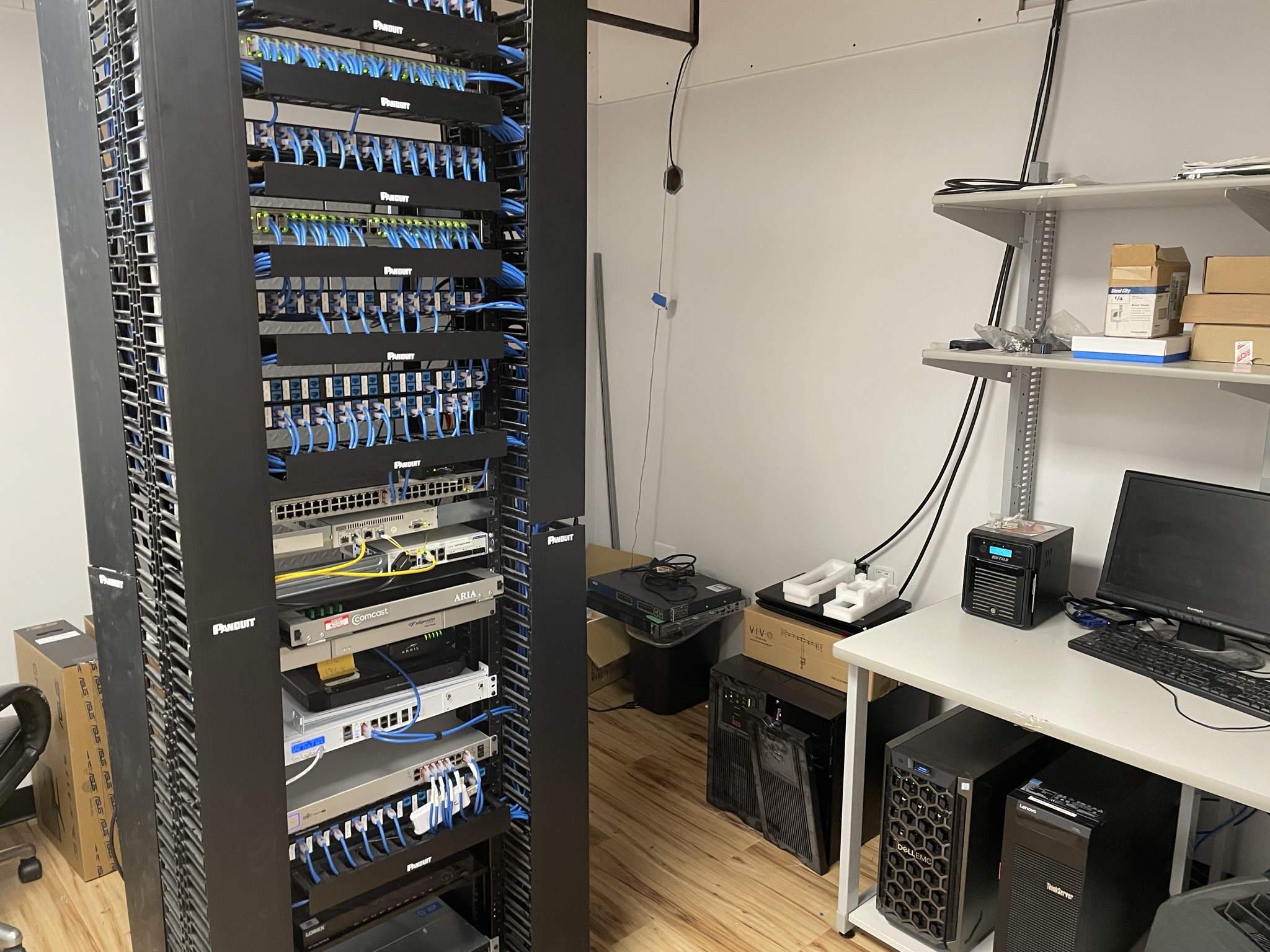 - MDF and IDF room buildouts with proper rack, patch panel, and cable management